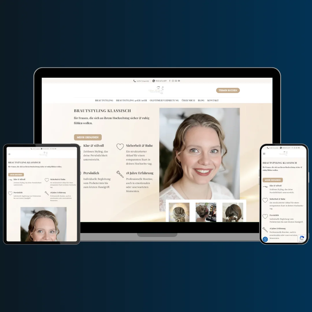 Hochwertige, feminine Webseite mit integrierter Blogfunktion zur eigenständigen Pflege. Klare Struktur, emotionale Bildsprache und optimale Darstellung für mobile Endgeräte.